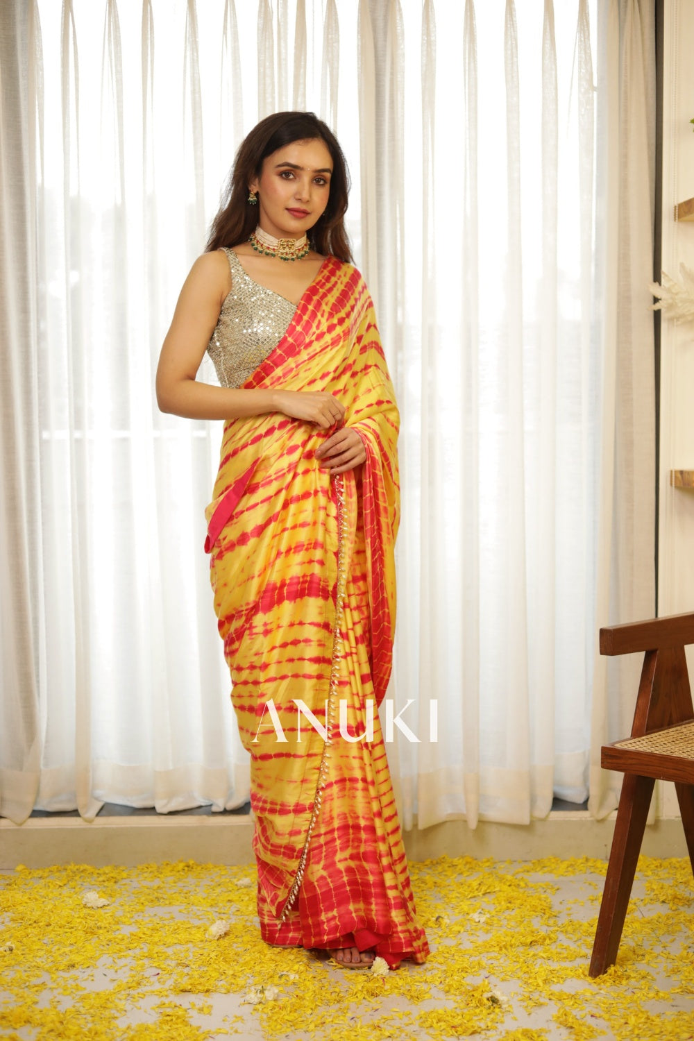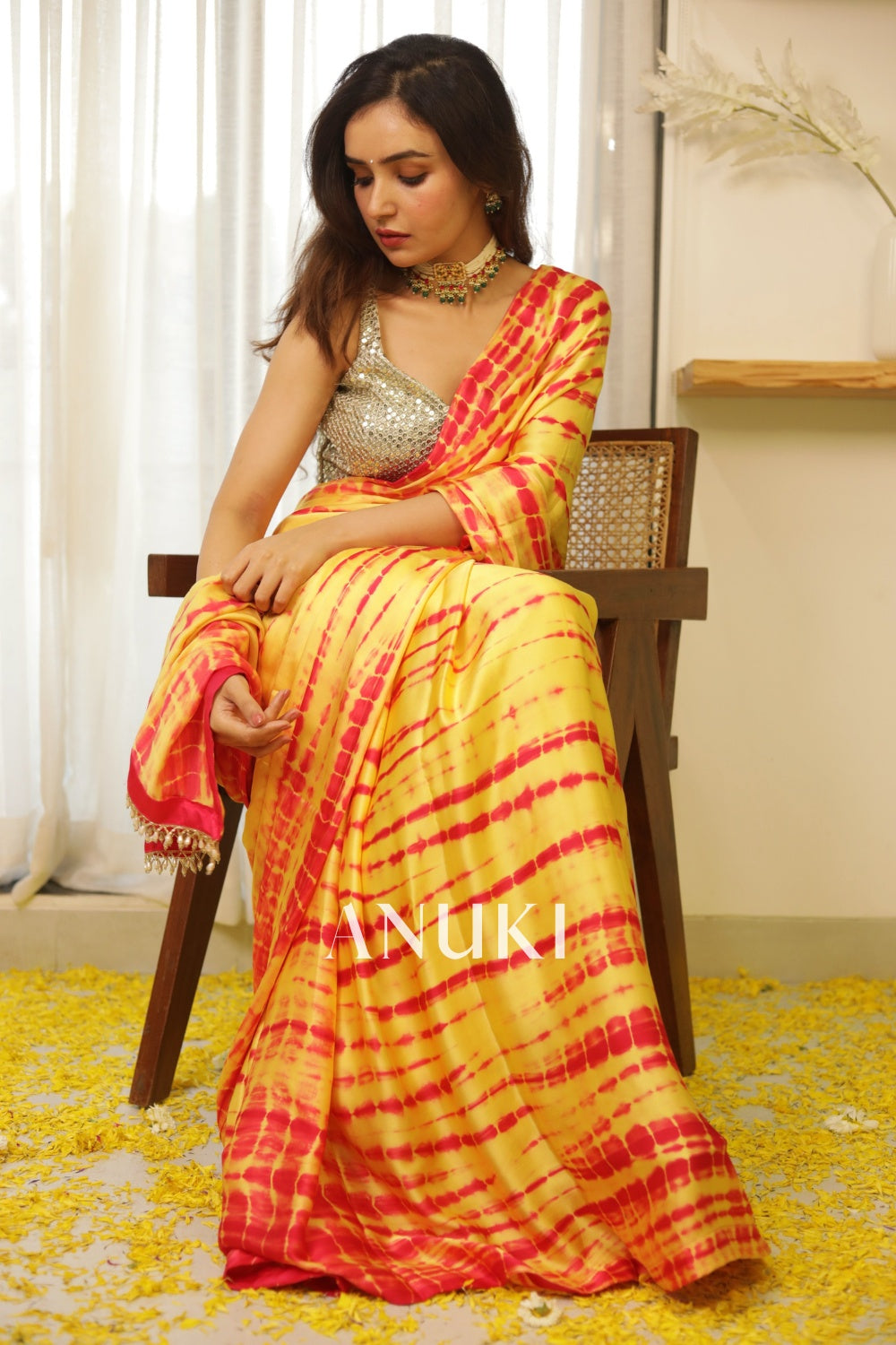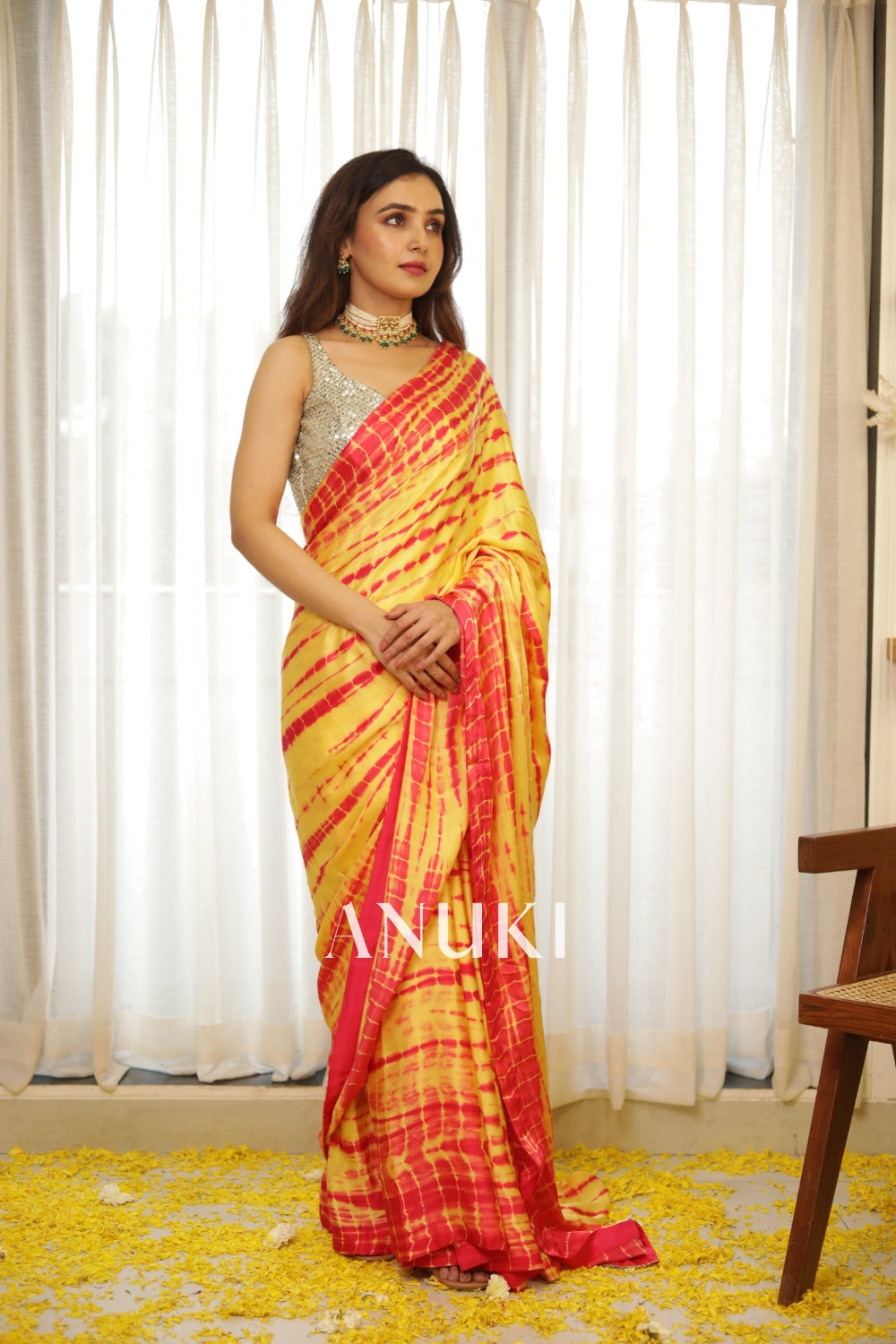 Featuring Yellow Pink Shibori Satin Silk Saree