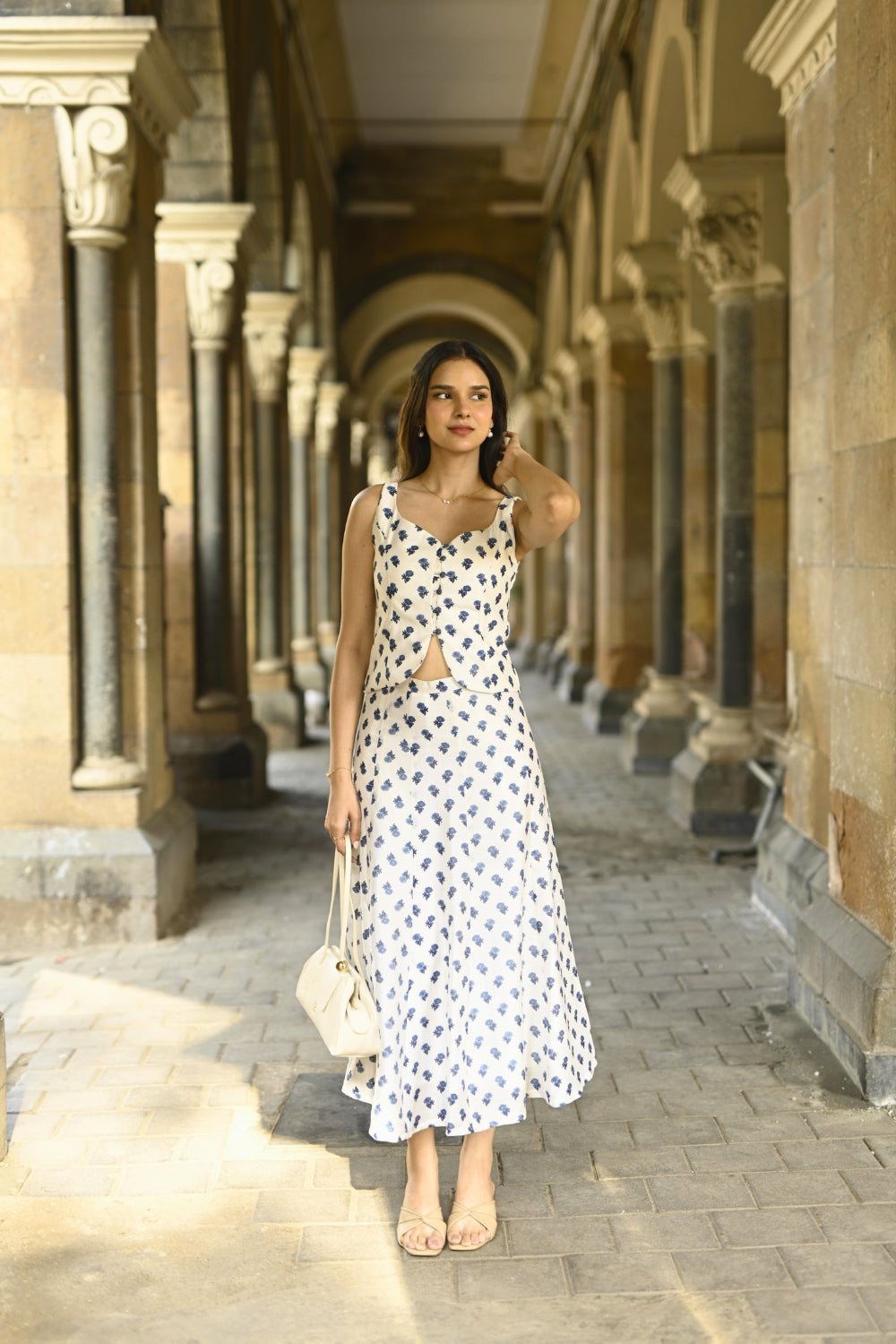It comes with a flowy maxi skirt with kalis that moves beautifully and feels super comfortable. The skirt is lined and can be styled with the top or worn separately with other pieces.