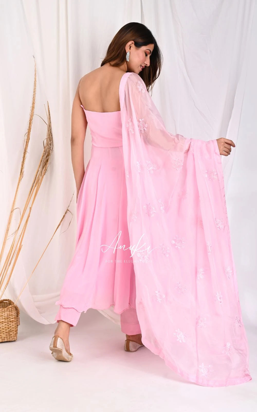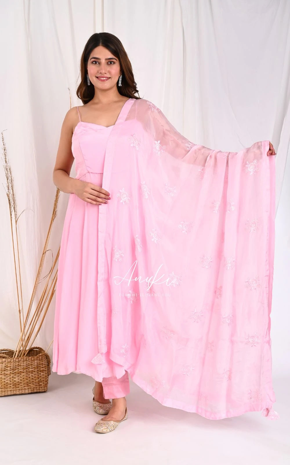 Featuring this Beautiful Rose Pink Anarkali Suit Set. This set comes with a Strappy Anarkali kurta, Pant, and dupatta.